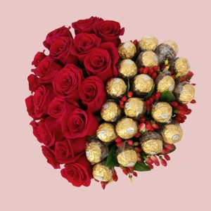 Corazón de 20 rosas rojas y 20 bombones Ferrero Rocher, ideal para alguien especial . alt. 25 cm