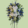 Hermosa cesta de flores blancas y detalles de flores azules para ser colocada al pie del Féretro. Los colores pueden variar según sus deseos.
