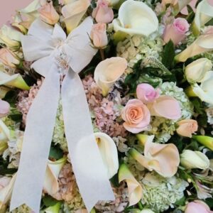 Arreglo de flores blancas, rosas, anturios y flores de hortensias, sobre trípode de fierro alto 2.10mts. aprox